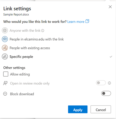 Ex: Let's say that Jackie and I are both Faculty members, and Jackie accidentally forwards that link to her class. Not a problem! Since I used the ‘Specific People’ method, that link will only work for Jackie.