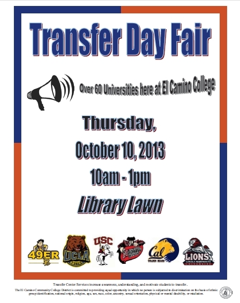 Want to transfer? Attend the annual Fall Transfer Day Fair from 10 a.m. to 1 p.m. October 10 on the Library Lawn. ECC’s Fall Transfer Day Fair is the largest transfer fair of the year, featuring representatives from more than 60 colleges and universities, including out-of-state colleges, private universities, and historically black colleges. Representatives from the University of California and California State University systems will also be available. Students are invited to ask questions, make contacts, and find out more information. The event is free and open to the public. For more information, click here.